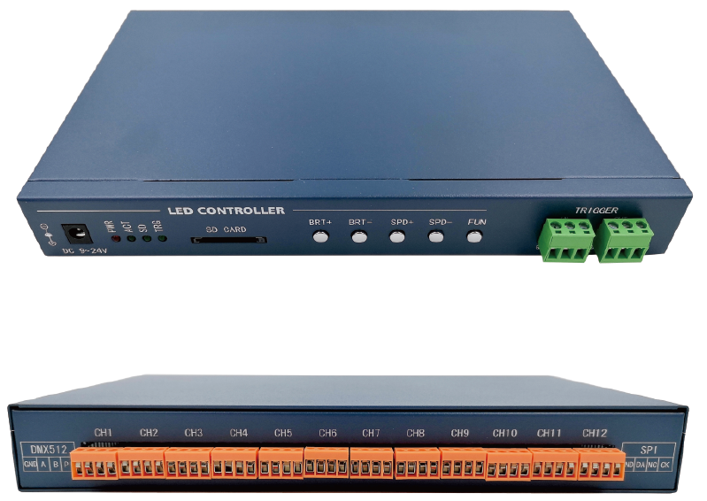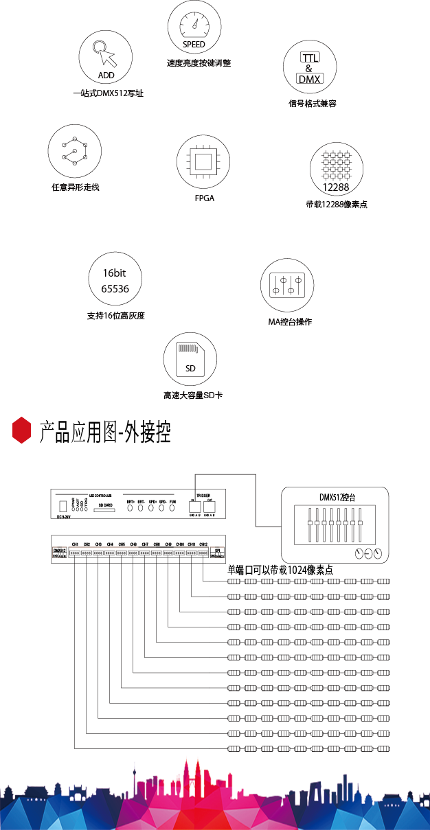 4,每个端口TTL可带1024,DMX512可拓展点数 5,支持DMX512在线写址,支持高速DMX512
