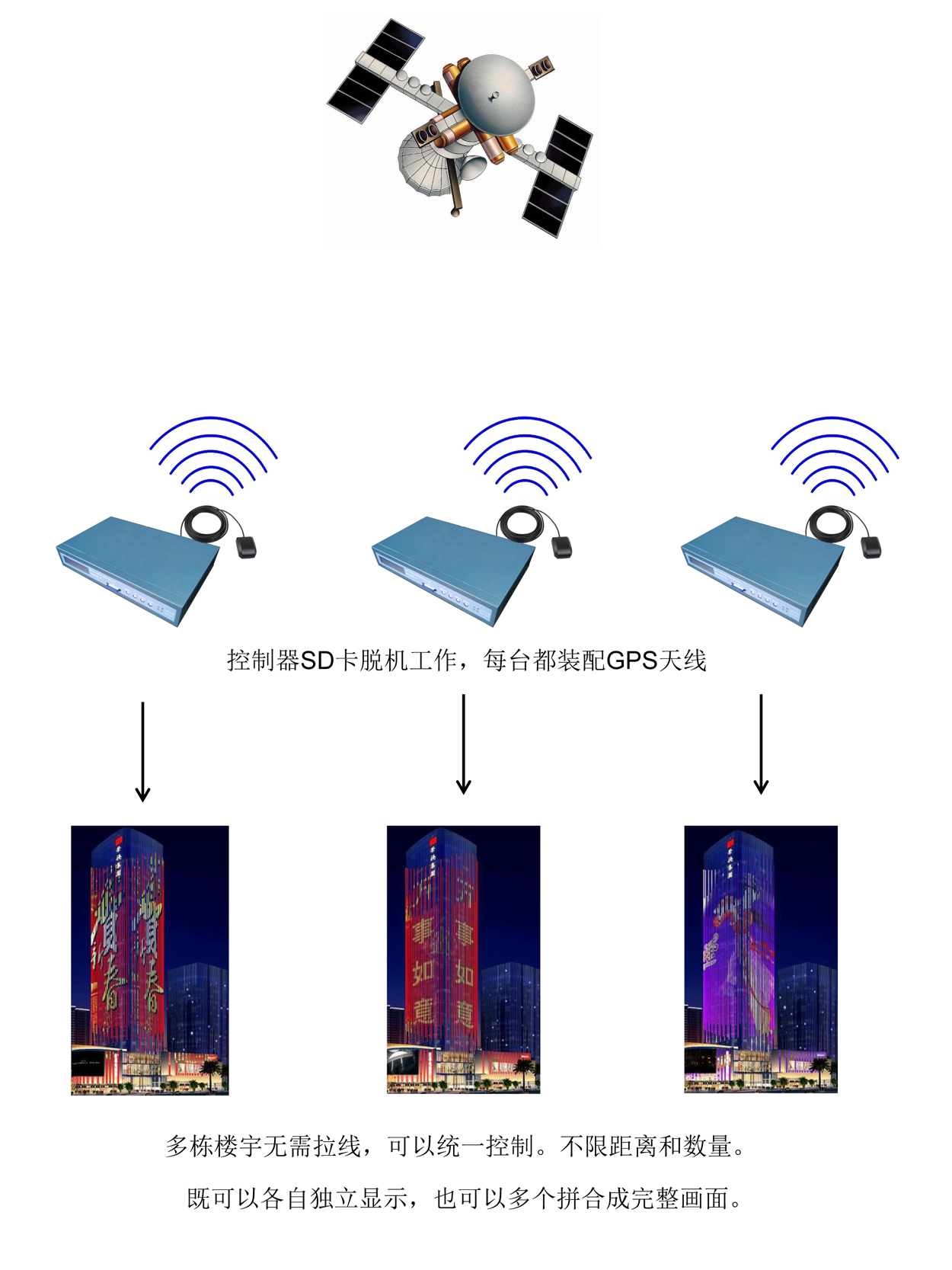 光影系列GPS无线同步方案,每台都是脱机使用(插上SD卡),采用卫星同步,实现多台控制器同步工作,组合成统一的控制系统。